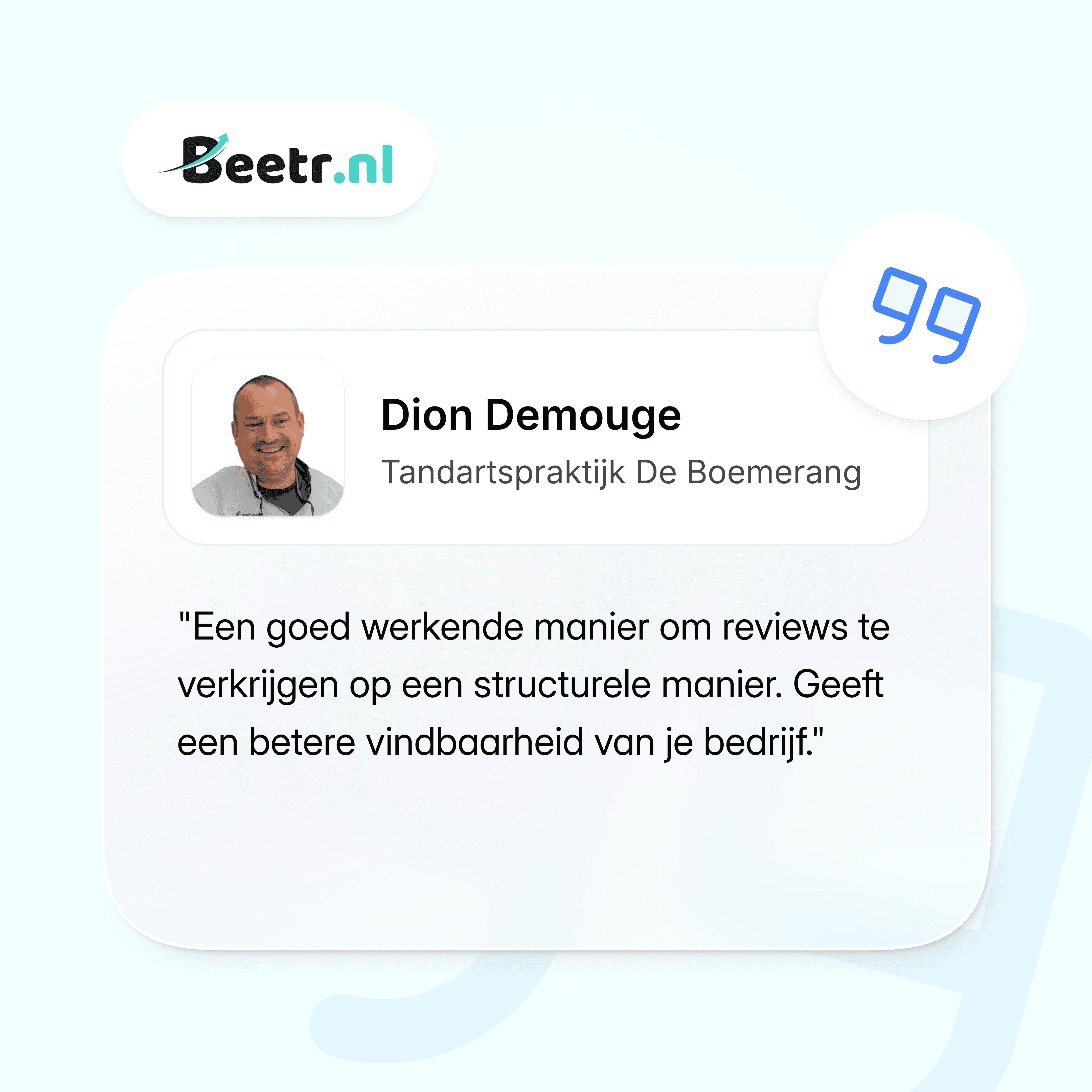 "Het verzamelen van reviews schoot er bij ons vaak bij in door de drukte van de dag. Beetr heeft dit volledig uit handen genomen. Het contact verloopt erg prettig en we merken dat zij precies begrijpen hoe ze onze patiënten op de juiste manier moeten benaderen voor een review. Het resultaat op Google spreekt voor zich!"